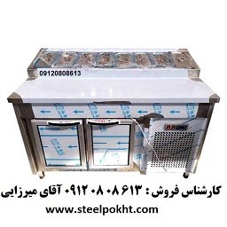 تاپینگ ۸ لگن پیتزا و ساندویچ یا سالاد بار که به صورت تاپینگ زیر یخچالی و تاپینگ زیر فریزری بنا به سفارش مشتری تولید می شود.